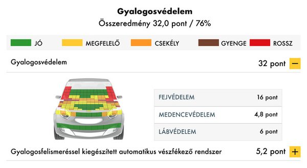 A gyalogosvédelemmel kevesebb problémája volt a kis családi Seatnak. 76%-kal és 32 ponttal az eddigi ranglista felső részéhez csatlakozik, még akkor is, ha nem kiemelkedő. A motorháztető kellően puhának bizonyult, azonban szokás szerint az A oszlopoknál és a szélvédő-motortérfedél találkozásnál van egy keményebb rész, ahol nem esik jól koppanni. A medencecsontot is megfelelően védi, csak a fényszóróknál vannak picit keményebb részek, komoly sérülést azonban még ez sem okoz. A lábakkal is óvatosan bánik a puha lökhárító, de persze senki ne gondolja, hogy egy gyalogosgázolás sértetlenül megúszható dolog.