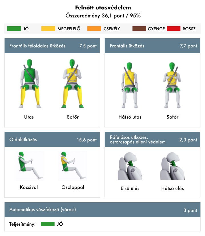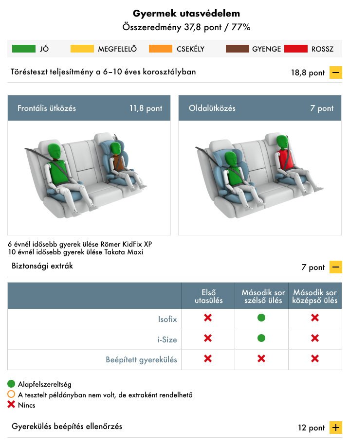 A gyermekvédelem viszont már nem ilyen kiemelkedő. A maga 77%-ával a középmezőnyt erősíti, és nem véletlen. Míg frontális ütközés esetén a tízéves gyereket mintázó tesztbábu védelme jó volt, a hatéves gyermek mellkasa gyenge védelemben részesül, és a nyakát is túl nagy húzóerő éri. Pont fordítva történtek a dolgok az oldalütközés tesztjénél. A hatéves védelme rendben volt, de a tíz éves gyermek egész felsőtestét olyan erő éri, ami akár komoly sérülésekhez is vezethet. Amire viszont nem lehet panasz, az a gyerekülés elhelyezése. Könnyű és érthető elhelyezni az autóban szinte bármelyik ülést. A mai autókhoz hasonlóan, csak a két hátsó ülésen van Isofix-csatlakozó. Övvel szinte bármelyik ülés bekerülhet, bármelyik helyre.
