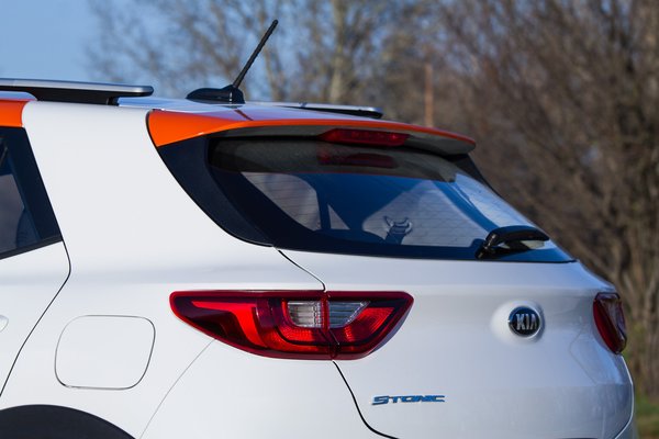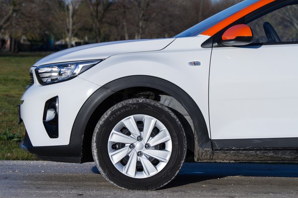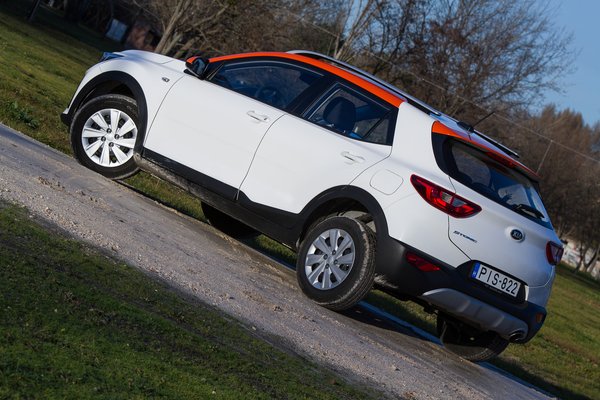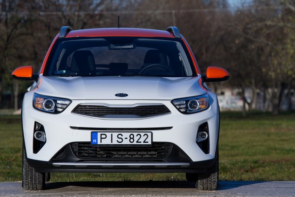 Bár a sziluett szinte megegyezik, túlzás, hogy a Stonic csupán egy kicsit megemelt Rio. Van saját egyénisége, de belül marad az aktuális márkaarculaton. Az alul-felül benyomott maszk a Rióénál szélesebb, és nem is ér össze a fényszórókkal. A szélesített kerékjáratokkal kicsit olyan az összbenyomás, mintha egy kismacska szúrta volna magát szteroidokkal. A forma kívánja a harsány színeket, ehhez képest a tesztautó fehér, de legalább a teteje narancssárga. Valami bevállalósabb színösszeállításban sokkal vidámabb lenne, de így sincs nagy gond. A Kiánál most nagyot mennek a formatervezők, hirtelen nem tudnék olyan modellt mondani a palettájukról, amit egyértelműen elszúrtak volna – a Picantótól az Optimáig mindegyik rendben van, a Stinger meg durván odaver.
