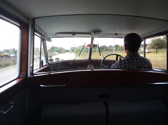 Ebben az Austinban viszont most már minden bőrből van, ami ront ugyan a korhű szellemen, viszont a XXI. századi agyunknak emészthetőbbé teszi a belvilágot. Ez eddig nem sokat számít, ami viszont igen, hogy a Princess tervezői, vagy még inkább a Vanden Plas-műhely szakemberei úgy vélték, a sofőr is ember – ebben tehát van akkora hely, hogy még az én 187 centis testem is beférjen a volán mögé, ne adj'isten, kormányozni is marad némi kalimpálni való tér. Máris kedvelem a fehér óriást.