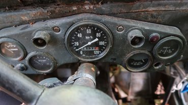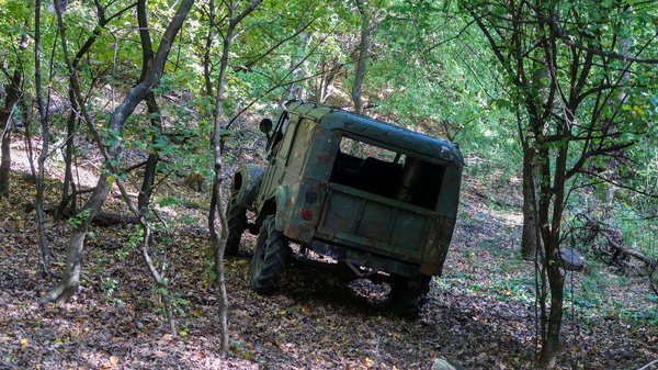 Az öreg harcos sebhelyek sokaságát viseli. A sárvédő mellett tátongó rést a rozsda sem tudja áthidalni. Minden elem horpadt, ütött-kopott, de a fényesnek nem mondható fényezés még az eredeti. A klímaberendezést felnyitható szélvédő pótolja, a fűtés viszont működik. Az ajtók nyílnak, és erősen becsapva úgy is maradnak. Lejtőn áll a gépezet, könnyen begurul, de magától is indulásképes. Halkan röffen be a motor, egészséges a hangja. A kétszemélyes utastér spártai: a szemlátomást újabb kori ülések még csak rendben vannak, de középen hiányzik a padlólemez, látszik a sebességváltó és a kardán, meg alul az avar. A műszerekhez nem árt az anno kínkeservesen felszedett orosztudás, legalább ki tudom silabizálni a cirill betűket.
