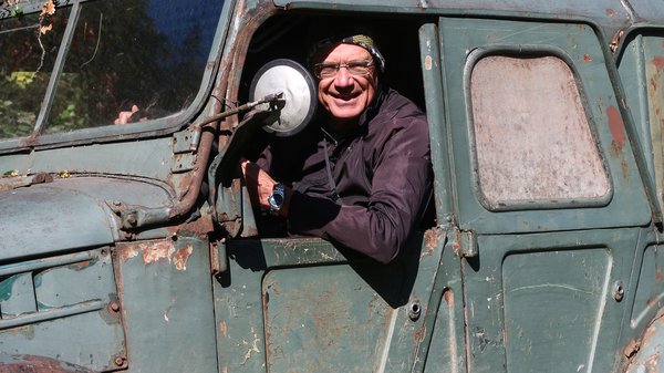 Persze lecövekeltem mellette, jól megnéztem, aztán ki is próbáltam Árpáddal, a gazdájával. Árpád az erdészettől vásárolt tűzifát szállítja haza vele, saját kezűleg tartja karban, de csak annyit költ rá, amennyit az üzemkészség fenntartásához okvetlenül muszáj. Van affinitása az ódon technikához: normális személyautója és Dutra traktora mellett nagyjából hat ilyen járgánya van. A pontos szám azért nem mondható meg, mert néhányuk mozgásképes, mások alkatrészbányaként szolgálnak, a legjobb talán le is lesz vizsgáztatva.