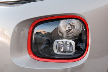 Ezzel éles kontrasztban áll a felső, keskeny, elegáns lámpatestet és az Citroën-emblémát a vékony vonalú krómozással összekötő sáv. Karcsú, lendületes és finom vonalak a bumfurdira domborított motorházfedél és az elnagyolt lökhárító között. Formai kakofónia, mégis működik.