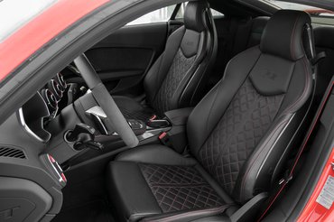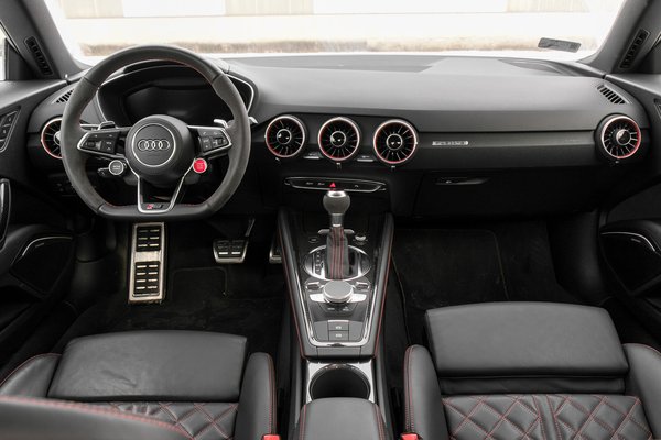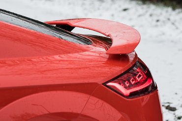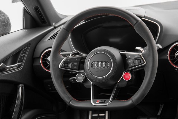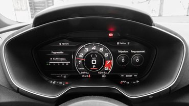 Pedig nem egy bonyolult forma, szinte alig vannak rajta részletek. Az orrához talán csak egy vonalzót használtak a dizájnerek, de a tekintetében van valami bestiális. Fenyegetően néz ránk a mátrix-LED fényszórópár, a lökhárító két szélének agresszív légbeömlői pedig mintha vicsorgást imitálnának. A négy karikát a maszkról a géptetőre emelték, maga a motorháztető pedig jellegzetes TT-örökségként a sárvédők fölé ér. Hátul egy szárny és két nagy, ovális kipufogóvég jelenti a látnivalót – az OLED hátsó lámpákban elrejtett Audi-logó és TT betűpár menet közben nem tűnik fel a járókelőknek.