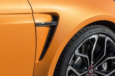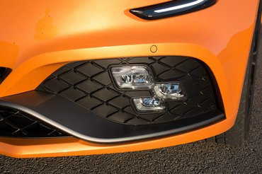 Bár vakrácsot gazdagon találni az első lökhárítóban, a matt-ezüst ívvel még a giccs határán bőven belül vannak. A jópofa, kockás zászlót imitáló led lámpák viszont nem csak dizájngegek – távolsági, kanyar és ködfény funkciót is ellátnak. A sárvédő nyílásainak szintén van feladatuk, a keréjárat légáramlását optimalizálják. A hátsó lökös alatti diffúzort sem dísznek tették oda, kettőötvenes végsebesség mellett elkél a leszorítóerő.