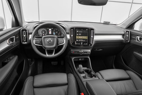 Elsőre az ember a szokásos új-Volvót azonosítja be az XC40-ben is: ott a függőleges orientációjú, hatalmas tablet a műszerfal közepén, az egyszerű és elegáns LCD-műszer a vezető előtt, a hüvelykujjnyi előválasztó kar az automatának, a kevés, hatásosan elhelyezett díszítés. De itt a légrostélyok függőlegesek, a négyzethálós, hajlított, matt alumínium (tényleg hideg mind) díszbetétekhez hasonló sincs más Volvókban, lépcsőt tettek a műszerfalba, nincs hangszóró az ajtókban, viszont a kartámasz furcsa, szecessziós íveket mutat be a panelen – ez egy ilyen fekete belsős autóban alig látszik, ezért is érdemes világosabb színben rendelni az utasteret.