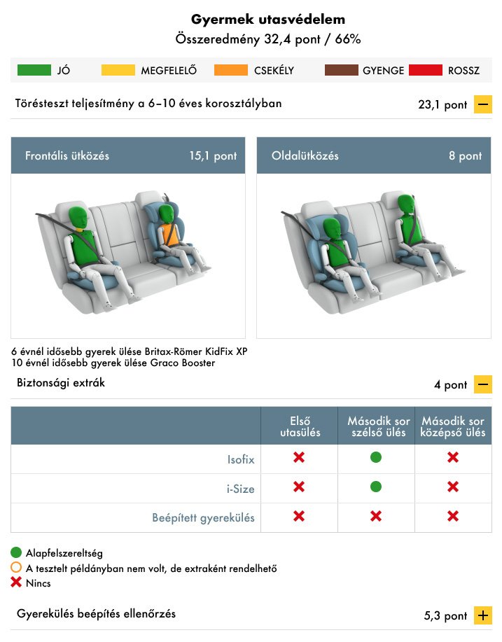 A gyermekvédelem átlagosnak mondható. Frontális ütközésnél a hatévest mintázó bábu mellkasán, és a tízévest mintázó bábu nyakán mértek túl nagy húzóerőt. Ezen felül a védelem jónak számít, sőt oldalütközésnél semmi probléma nem volt. Az anyósülésen a légzsák könnyedén kikapcsolható, egyértelmű visszajelzést kapunk, és a gyerekülés elhelyezésével sincs gond – legalábbis elöl. A két hátsó ülésen ugyan van Isofix-csatlakozó, de sok gyerekülés nehezen vagy egyáltalán nem rögzíthető. A csatlakozók nem feleltek meg az Euro NCAP előírásainak, így erre az autó kevés pontot kapott. Összesen 32,4 pontot, azaz 66%-ot ért el a Duster, amivel szintén nem emelkedik ki az eddigi ranglistán.
