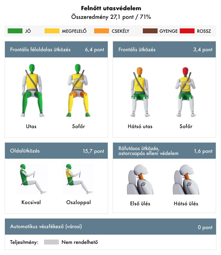 A Duster felszereltsége sem kiemelkedő, így biztonsági elektronikákból is csak a legszükségesebbeket kapta. A biztonsági öv bekötéséért elöl és hátul is két-két ülésen jelez fénnyel, hanggal. A sebességhatároló is szépen tette a dolgát, de ezeken kívül nem volt mit pontozni, így mindössze 37%-os eredményt (4,5 pont) ért el.