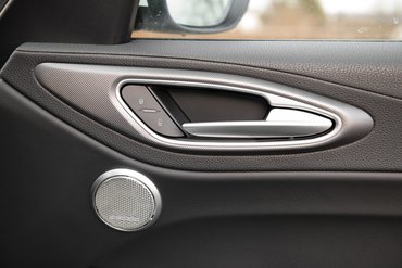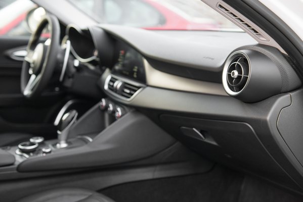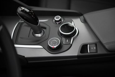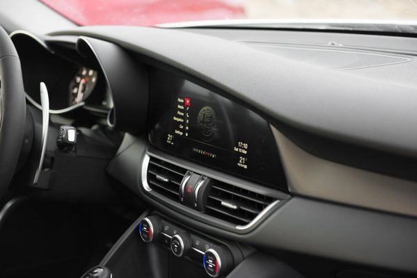 A belseje, na az még kevésbé fárad el. Annyira, de annyira feltalálták most az Alfánál ezt a monokróm világot, hogy szerintem a konkurencia dizájnerei máig sem heverték ki. Vagy azt, hogy ez nekik nem jutott eszükbe, vagy hogy eszükbe jutott, de a főnökség nem engedte. Drágább Giuliákban van piros bőrkárpit, de hülyeség, nézzék csak meg a Veloce tesztjének képeit: a sok piros szinte agyoncsapja. Egy Alfát! Hogy még a kormányemblémában sincs színes zománc... Egyszer már kikészültem ettől a Stelvio bemutatóján, de ezt nemhogy megunni nem lehet, de minden alkalommal kikészül tőle az ember. Az a kijelző a műszerfalba simítva! Hogy bár téglalap alakú az összes, de ha rárakunk egy füstüveget, bármilyen alakú lehet. Ó, alfás belsőépítészek! Ahogy a jobb oldali beömlő húzza maga után a domborítások merész éleit, mint üstökös a csóváját – tudom, valójában a napszél fújja, de nem érdekel.