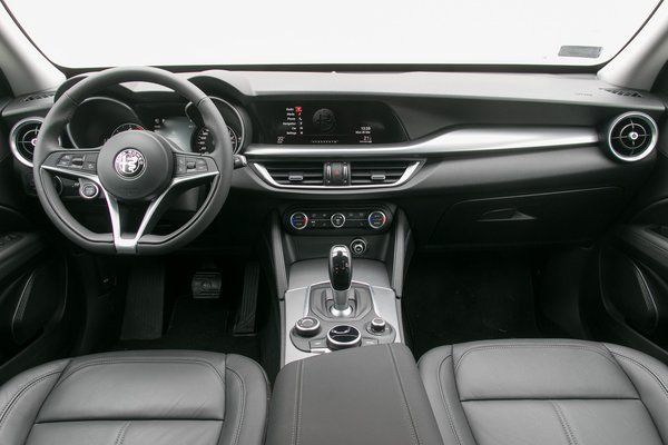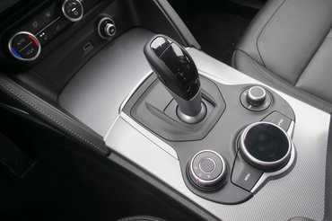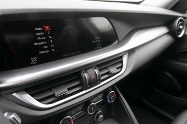 A beltérben is érződik a Giulia-rokonság, elég, ha csak a szellőzőket, a kormányt vagy a váltókart és közvetlen környezetét nézzük. Kábé egy az egyben ugyanaz. Nagyon rendben vannak a formák, még ebben a szürkében is. A központi kijelző beépítését bátran állíthatják bármelyik, önmagát prémiumnak gondoló gyártó elé is: igen, így is lehet, szépen beledolgozva a műszerfalba, hogy annak szerves részét képezze, ne csak egy hanyagul odavágott tabletnek tűnjön.