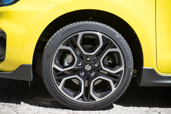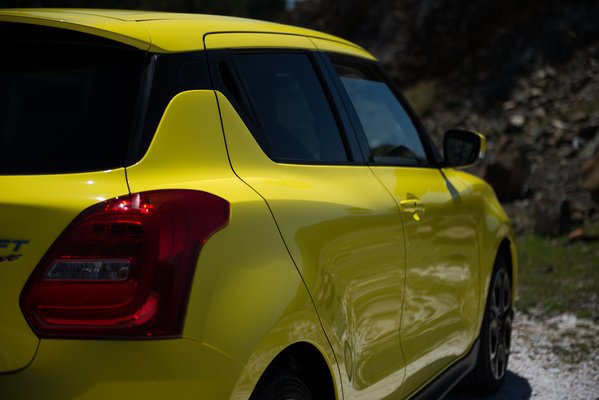 Pozitív, hogy a domborításokkal az autó elejét hangsúlyozzák, és nem erőlködtek a szokásos, ugrani készülő nagymacska koncepcióval, amit én elsőkerekes autóknál mindig kicsit nyomorult dolognak érzek. Itt bezzeg a Sporthoz adtak még két oldalsó orrbeömlőt, dupla kipufogóvéget, 17 colos kerekeket, nem beszélve a színekről. Az európai bemutatóra csak sárga autókat hoztak, amit a Suzuki Champion Yellow-nak hív, magyar fordítás még nincs, remélhetőleg nem bajnoksárga lesz belőle. Volt már ilyesmi színű Swift Sport, de nem ennyire zöldes-feketés, ki is írtam egy közösségimédiás pályázatot a megfejtésére: a szövegkiemelő-sárga egyértelműen nyert.