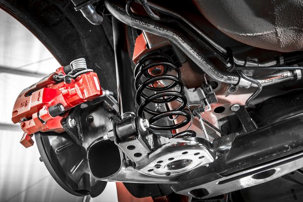 Ha valaki itt csak egy rugót lát egy szimpla csatolt lengőkaros hátsó futóműben, ahogy én is, megnyugtatom: a furmány nem látszik, de van. A cél a Nagyon Különös Nevű Rugóval, hogy kompenzálják a szögegyszerű hátsó futómű hátrányait, nevezetesen hogy kissé csámpásan állnak a kerekek kanyarban, ha elviselhető rugózást akarnak csinálni – vagy fordítva: ha nem csámpás, kirázza a beledet.