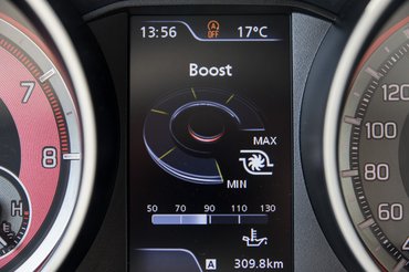 Bőszen tol, 2000-es fordulattól bárhol, mintha nem is egy 1,4-es turbó, hanem egy jóval nagyobb szívómotor lenne. Kedves geg a digitális töltőnyomás mérő, amely számokkal ugyan nincs felosztva, de a fordulat emelkedésével, a nyomatékcsúcs után visszaesik az ábra, tehát valószínűleg nem csak egy animáció, hanem valódi értéket mér. Ugyanígy hasznos, hogy van olajhőmérő, sokszor látszott is, hogy az igazán fontos kenőanyag hőmérséklete még sehol sincs, amikor a vízhőfokmérő alapján már bátran toltam volna a Swiftnek.