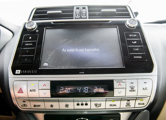 Kényszeresen keresem a hasonlatot, hiszen ennyire ócska fogású műfa kormány szerintem még egy olvasó kezében se volt, de tanácstalan vagyok. Majdnem leírtam, hogy egy vállaltan gagyi, hamis kínai Barbie-bútorban fordulhat elő ilyen, de tán még abban sem. 1982-es olcsó magyar Réka gyerekbútor? Ki merem mondani, a Toyota – ami a dizájnt és a komplett belsőépítészetet illeti – nagyon elkutyálta magát. Mindez nem a strapabírás miatt van, ne áltassuk magunkat. A Land Rover Defender belseje például szintén igénytelen, csak az karbantartási értelemben. És akkor még nem mondtam, milyen a kijelző. Nem is mondom, inkább mutatom.