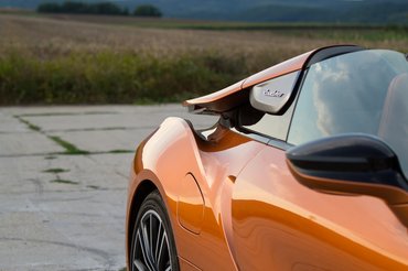 Nem mintha számítana a tető, hiszen az i8 még a legjellegtelenebb szürke-fekete színösszeállítással sem kevésbé feltűnő, mintha leszállna egy űrhajó a Hősök terére. Támogatom a szupersportautókra a lehető legvulgárisabb színeket, a Koenigsegg babakékje talán a műfaj legjobbja, de az i8 is iszonyat show a narancs-bronz-arany metszethalmazába belőtt árnyalattal. Sokáig gondolkodtam, mitől olyan átütő az i8, hiszen a sziluettben semmi különös nincs, úgy néz ki, mint bármi, aminek a formáját a középmotoros anatómia határozza meg. Aztán rájöttem: a kabin mögötti rész a lényeg.