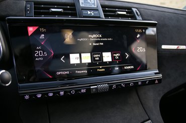 A menü átlátható, szép, és ugyan alkalmanként megröccen, elakad, de alkalmas az együttélésre, hiába nem egy mérce például egy Audiéval. Egyértelmű közönségkedvenc viszont a szellőzőrostélyok közül motorindításra előforgó klasszikus, analóg óra. Ez egy B. R. M. ami nekem mint versenyautó-gyártó volt meg, de nem, a három betű a Bernard Richards Manufacture rövidítése. A cég 2003 óta gyárt borzasztóan drága karórákat, a 3,4 millió forintért kínált modelljük még inkább a kínálat közepe. Tekintve, hogy a DS 7 alapára valamivel 10 millió forint felett lesz, nem tartok tőle, hogy valódi automata szerkezet kerül majd a műszerfalba. A márkára jellemző lyuggatott mutatók és extravagáns számlap – valószínűleg ez jön az órás cégtől, hasonlóan, mint a Mercedes-Schaffhausen együttműködésnél, ahol a mechanika egy taivani gyártósorról jön. Ettől függetlenül már az is show, ahogy kinyílik, meg maga a vekker is mutatós.