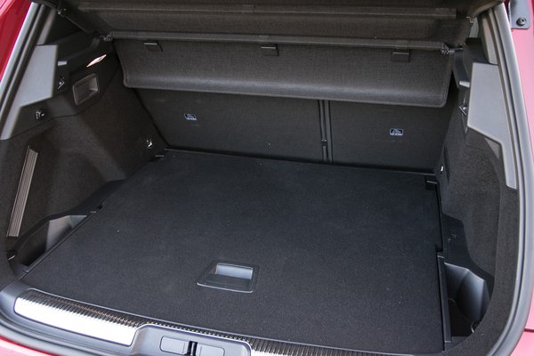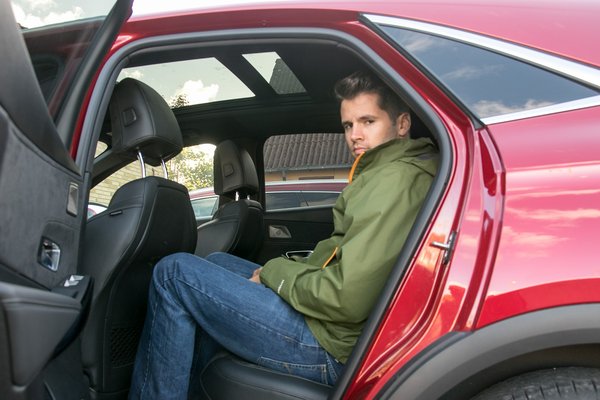 A szokatlanul lendületes hátsó tetővonal viszont azzal jár, hogy bár a fejtérrel nincs baj, de a hátsó ablak elég szűk, erre hagyatkozni tolatásnál necces, viszont prémiumság ide vagy oda, a négykamerás panoráma minősége utoljára egy generációval ezelőtt ment volna el. Van viszont csomagtér, 555 literes, tálcával szeparálható csempész-rekesszel, a padló szemre vagy 10 kiló kokaint elnyel, igaz, a variálható padló feláras extra.