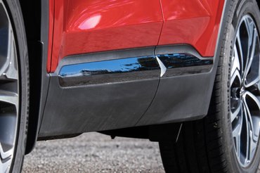 Amióta Peter Schreyer elkezdett ránézni a Hyundai márkára, és egyre többet lengeti a különféle autók fölött a fekete pálcáját, annál inkább eltűnnek róluk az európai szem számára torz részletek, öncélú ívek és hullámok, no meg a mindent átható, jajdecuki gömbölyűség, amitől minden Hyundai-nak volt egyfajta dohos 90-es évek hangulata még nem is túl régen. Ezen a Santa Fén, akárcsak az új i20-on, i30-on, rendesen állnak a vonalak, vannak kontúrok, találkoznak a hajlítások, az új, egységesített maszk pedig ilyen nagyban mutat rendesen, nem a többi, kisebb modellen. A fenébe, még a hátulja is egész csinos azzal a kunkori lámpával, homorú hátfallal. Pedig alapvetően ez is csak egy nagy, orros busz.