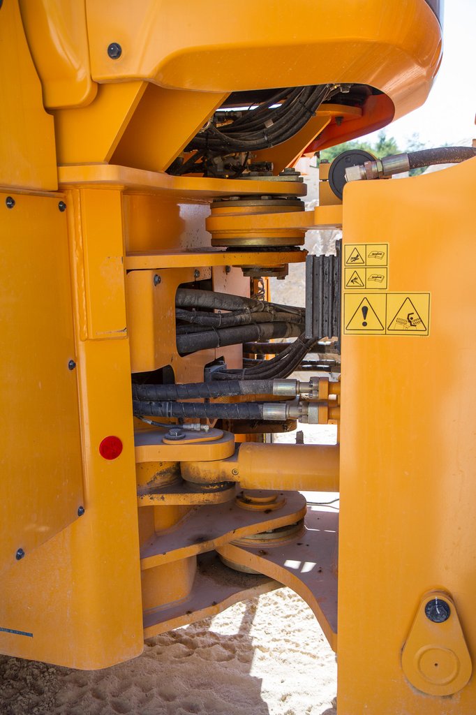 A derékcsuklós/ízelt gép titka a kisebb fordulási folyosó: mivel ez nem a gép kormányzott kerekeit forgatja el, hanem az elejét a hátuljához képest (maximum 40 fokkal), az első és a hátsó kerekei ugyanazon az íven közlekednek, vagyis ahol az eleje elment, ott a hátulja is el fog. Persze készíthetnének összkerék-kormányzást is, de a 30 tonnás gép és a pl. 18-20 tonnás kőtömbök tömege miatt eszméletlen nagy teherbírású kormánycsuklókra lenne szükség, továbbá a hatalmas kerekek elfordításához hely is kéne ám. Vagyis minden bonyolultsága ellenére az ízelt kialakítás sokkal egyszerűbb bárminél, ugyanakkor nagyon pontosan irányíthatóvá teszi a gépet, amely mellesleg összkerékhajtásos is. Érdemes megnézni, hogyan kanyarodik a terepen, a videón megmutatjuk, mert vittünk drónt is: