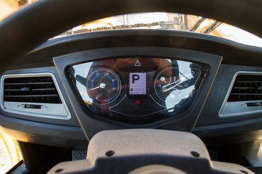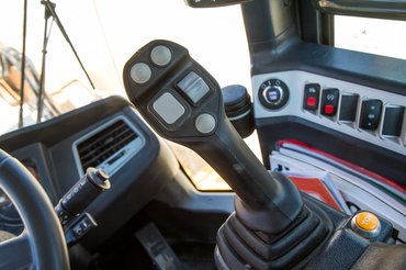 Ami a legszokatlanabb az egészben, természetesen a csuklós kormányzás. A kormányszervó meglehetősen bivaly, és amikor az ember megmozdítja a kormányt, hatalmas munkahengerek mozdítják el a gép első és hátsó fertályát – a gyors mozdulatokra olyan hirtelen reagál, hogy ha áll valaki a fülkében, könnyen eleshet. Vagyis a kapkodásról hamar leszoktam, nem akartam megölni Károlyt sem, aki bent videózott. A csukló előtti részen van az emelőkar, a hátsón pedig a fülke és a motor.