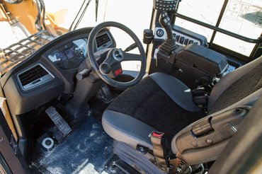 Tulajdonképpen az egész munkanap lerobotolható a kellemes fülkében, ahol a mai mezőgazdasági gépekhez hasonlóan egy kormánykerék, két pedál, egy joystick és egy érintőképernyős-gombos kezelőrendszer szolgál a gép irányítására. De János elárulja, hogy a bányában dolgozó, régebbi, még nagyobb Caterpillar rakodógépnek kormánya sincs, csak joystikos. Mindenesetre ő ezt szereti, igazából ezzel a kombóval már értelmezhető módon tudtam kezelni én is a gépet, amikor először megpróbáltam.