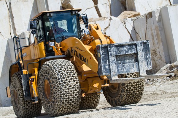 A kőtömb felemelése után nem sok változás érezni azon kívül, hogy ott látom magunk előtt, tehát a Hyundai nem lesz érdemben lomhább, de azért ésszel kell kezelni a gázt, mivel a gépnek saját rugózása nincs, mindössze annyi, amennyit a kerekek rugóznak. A hatalmas láncok természetesen nem a hó ellen kerültek a gumikra, hanem hogy védjék azokat az éles kődaraboktól, illetve ha sár van, jobb tapadást adjanak. Tehát egy ilyen kerék nem sok rugózást ad, bár a kezelő szempontjából ez szinte mindegy a légrugós ülésben, viszont a rakományt nem kéne lerázni az emelővilláról. A mozgás mindenesetre nem kihívás a géppel, tolatáskor kamera is segít, előrefelé nézve pedig egy valag tükör ott van, hogy az ember lássa, van-e lent valaki a mélyben, mondjuk a kerekek takarásában.