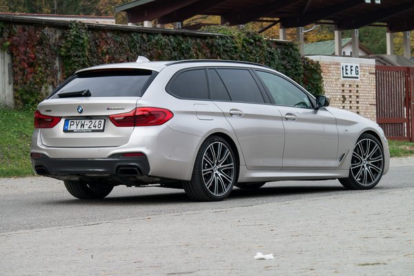 A hatás még engem is meglepett, pláne az Audi A7 55 TFSI tesztautó után, ami lomhább autó volt (0-100: 5,3 s), mégis sokkal sprődebben rugózott az M550d-nél – megkockáztatom, hogy ez főleg a stabilizátor-trükk eredménye. Igaz, ezek a különbségek tényleg a milliós futómű-felárak világában értelmezendőek, de a BMW stabilitásban és az útegyenetlenségek szűrésében is agyonverte a full légrugós Audit, méghozzá úgy, hogy gyorsabb nála. Igaz, az M550d Touringban hátul légrugó van, de főleg hogy a terhelés hatására ne üljön le a kocsi feneke. Mindössze 13 centis hasmagasságnál és 3 méteres tengelytávnál ez gyakorlati szempontból is fontos (ne akadjon fel a fekvőrendőrön), de a dinamikai tulajdonságokat is jó irányban befolyásolja.