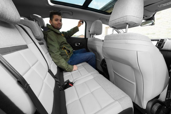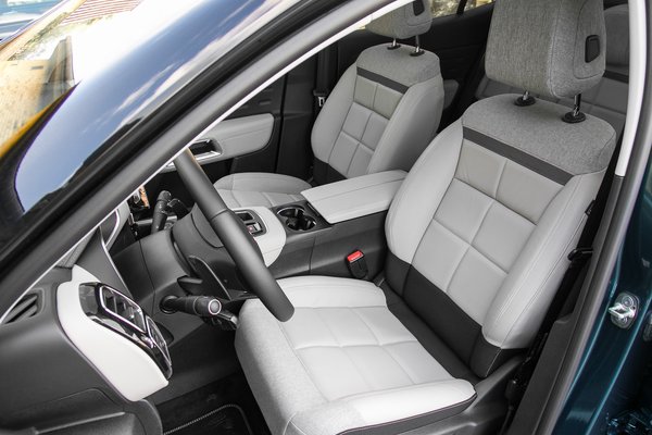 Tökéletesen rímel a belső a külsőre, például örömmel tölt el, hogy a Citroën felfedezte, a steppelésen túl is van élet, ezek a nagy kockák a huzaton elég mutatósak. A teljes belső bútorzat ilyen kicsit merész, szokatlan, de mégsem giccses, olyan pont jó. Két dolog lóg ki, az egyik a telefonkagyló formájú egyen-PSA-váltókar, a másik a tempomat kapcsolója, ami úgy ragadt itt 20 évvel ezelőttről, hogy az már Lexus-emlékdíjat érdemel. Nem csak elüt, de rosszul is néz ki, ráadásul minden alkalommal, amikor az ember ráfog, a reszketeg gombok miatt mintha szét akarna esni. Ez amúgy az egyetlen probléma, mindenhol máshol összejön a bravúr, vagyis, hogy olcsó anyagokból építettek egyáltalán nem olcsónak érződő belsőt. Nyilván nem olyan minőségi, mint egy Audi, de nem is annyira halott. Ebben is csak a szélvédő páramenetesítés és a belső keringetés kapott saját gombot, a klíma kezelésére továbbra sincsenek fizikai gombok, csak remélhetjük, hogy a ráncfelvarrásra megkapjuk ezeket.