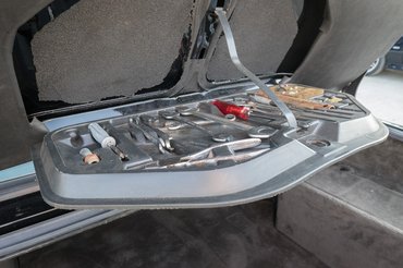Ha pedig mégis venném a fáradságot (amit csak a pályázás után vettem), észrevehetném, hogy ebben az M-es ajtóban nem műanyagból készültek az ajtóburkolatok, hanem mind varrott bőr, mint ahogy a műszerfal alsó és felső részét is hasonlóan borították. Talán csak azért nem szúrtam ki ezt magamtól, mert a színek eléggé műbőrösek, mellesleg pedig a műszerfaltető, ami a szemem előtt volt végig, egy szabványos E28-asból való, tehát nem varrott. A régi ugyanis elporladt; ha meg szeretnénk őrizni egy autóbelsőt az utókornak, ezért kell mindig kitenni napvédőt a szélvédő mögé. Pojácaság, de a műszerfal az egyik legnehezebben beszerezhető és reprodukálható pótalkatrész young- és oldtimeres körökben.