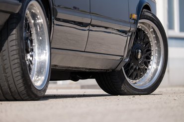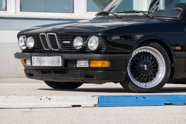 Várni kell, amíg felengednek az aszfaltra, mert még az előző turnus köröz odabent, ezért közben elkészül a fotósorozat. A keresőn át figyelek fel rá, hogy ennek az E28-asnak más a kiállása, mint a hasonló, szerényebb verzióknak. A szín, az ültetés, a kötény – nem lehet ujjal rámutatni, mi teszi, de sokkal jobban néz ki. Na meg persze, a kerekek. Ezen a kocsin erős nyálelválasztást generáló, 17-es BBS-ek vannak, amelyek ma önmagukban is kiadják egy tűrhető használt autó árát. A gyári méret az E28 M5-ön egyébként 16-ös, s ennél a plusz egy collnál nagyobb kerekeket nem is lehet rá feltenni, tehát Soma elérte a falat a setuppal.