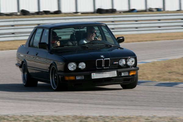 Minden másra ott a gáz és a kormány. Az E28 azért érdekes az M5-ösök sorában, mert ez még rendes, túlságosan is túlkormányzottnak (magyarul: seggeldobósnak) tervezett autó. Annyira könnyen keresztbe áll, s abban a helyzetben olyan simán stabilizálható ellenkormánnyal, majd onnan annyira dráma nélkül tér vissza az ívre, hogy az már művészet. Nem csoda, hogy az én négy köröm után Soma még másik négyet belerakott a kocsiba, nem sajnálva a Dunlop SP Sport Maxxokat. Mert ezzel az autóval épp az a pazarlás, ha az ember nem pazarolja el a futófelületet, amint versenypályára ér.