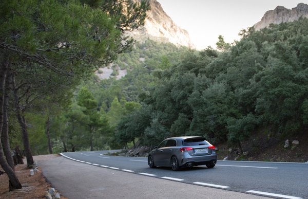 Jó mérnök nem rinyál, megcsinálja, amit kell, ezt pedig nagyon jól megcsinálták. A turbólyukat olyan ügyesen eltüntették, hogy direkt dolgozni kell, hogy az ember előcsalogassa. Mondjuk emelkedőn magas fokozatban határozatlanul lepadlózni. Különben nem tudunk belőle gyengeséget előcsalogatni. Az olyan szerpentinen, mint ez a nyugat-mallorcai, vagy nálunk a dobogókői, vagy a 24-es út, nagyjából a 2-es és 3-as fokozatot váltogatjuk, de ha nem sietünk, tehát mondjuk nem satuzgatva farigcsáljuk a féktávokat, csak úgy jólesően száguldozunk, a 3-as is bőven elég. A 7 sebességes dupla kuplungos váltó úgy váltogat, mint egy jó dupla kuplungos, nyilván a keresztmotoros platform miatt nem rakták bele a többi Mercedesben működő 9-es hagyományos automatáját.