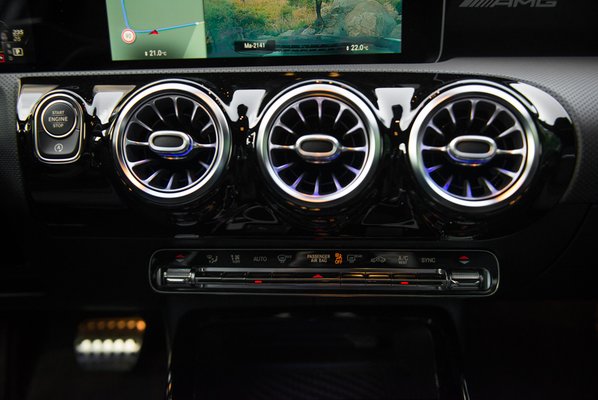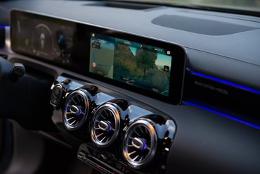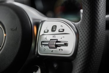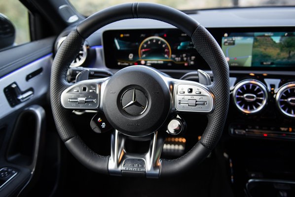 A reneszánsz dráma hármas egységének, meg a népmesék szellemében a navit követheted a nagy képernyő jobb oldalán, a hagyományos műszerfal-rész jobb oldalán, a fordulatszámmérő helyén, de a szélvédőre vetített head up display-en is. De, hogy kilegyen a három, három helyen dönthetsz róla, hol mi jelenjen meg. Először ott, ahol régen a Mercedes iDrive-ja, a Comand volt, de ez már nem Comand az új A osztály óta, hanem MBUX, Mercedes-Benz User Xinterfész, gondolom. Hangzásra mint amikor egy brókernek (BUX) idegességében visszafelé jön a savas béltartalom (reflux), de majd megszokjuk. Szóval állíthatod a BMUX-szal, állíthatod az érintőképernyőn, de állíthatod a kormány két érintőgombjával is.