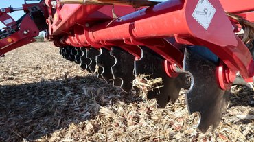 Itt van például ez a 110 hektáros kukoricatarló, amelyen ismerkedem a géppel. Akkora, hogy egyik végéről nem is látszik a másik. Jó volna két nap alatt végezni a szármaradványok betárcsázásával, a talaj fellazításával. A célnak megfelelő Horsch Tiger 6 MT nehéztárcsa nem akármilyen szerkezet: kapái harminc centi mélyen hasogatják a közepesen kötött, kissé agyagos humuszt, egyetlen ilyen elegendő lenne arra, hogy mozgásképtelenül lehorgonyozzon egy terepjárót.