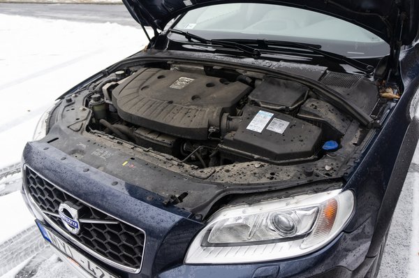 A tesztelt autóban 2,4 literes, öthengeres dízelmotor (D4) volt, ami a kínálat közepén helyezkedik el. Alapjáraton éreztem némi rezonanciát a kormányon és a pedálokon, de állítólag ez újonnan is ilyen volt. Egyébként a motor még nem volt megbontva, csak a kötelező szervizeket végezték el az autón, az olajat a gyári előírás szerint harmincezrenként cserélték. Ebből a 2.4-es motorból volt gyengébb (163 LE) és erősebb (220 LE) is, de legalább mind öthengeres, négy hengerrel csak a sima kombit lehetett kérni. Az Excel-táblán kívül is jó kompromisszumnak tűnik ez a D4-es. A 181 lóerő és a 420 Nm bőven elég, tíz alatt megvan a nullaszáz még ezzel a némi spéttel kapcsoló, hatfokozatú, hagyományos automatával is. Jó dolog az öt henger, magasabb fordulaton tök jó tónussal szól, egy percig sem zavart, hogy gázolajat kell tölteni az autóba.