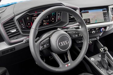 Akinek megvannak fejben az Audi-kínálat nagyobb darabjai, mondjuk a kortárs középmérettől felfelé, abból kihozza a mosolyt az első beülés. Vicces látni, hol kellett egyszerűsíteni, bocsánat, méretre optimalizálni a kialakítást. Így lett például az utasoldal előtt a kettőből vizuálisan egy nagy szellőzőrostély, amiről helytakarékosságból az elválasztókat lespórolták, így még ha szemre egybe is ér, két irányban állítható.