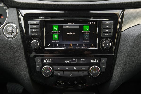 A 7 fokozatú duplakuplungos automatával jól is megy a Qashqai, 9,9 a 0-100, és bármilyen tohonyaságot ígérne a papírforma, még 120-as tempónál is elfogadhatóan gyorsul. Új a Nissan Connect rendszer is, ami képes telefont tükrözni. Ha valaki nagyon erőszakosan lépne fel, hogy próbáljam ki, adnék neki egy esélyt, de nem jött senki. A virtuális körkamera is olyan Renault-Nissan extra, ami megelőzte korát, hogy már kisebb-olcsóbb autókba is rendelhető volt. Most egy járdaszegély mellé parkoláskor nem igazán szerepelt jól: a felülnézeti képen határozottan úgy nézett ki, hogy van hely a szegély és az autó oldala között, aztán ahogy gurultam, lassan elkezdte darálni a gumik oldalfalát.