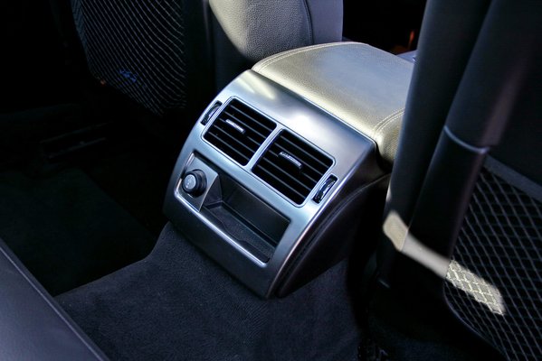 Hátra beülve hasonló a helyzet, ott viszont nem tetszik ez a szitu, mivel magam mögött (172 cm magasság) éppen befért a térdem, ebben a kategóriában azért ez szűk hátsó helynek számít. A fejem fölött is csak hét centi maradt, ez nem egy sofőrös autó, családos is csak addig, amíg a gyerekek nem nőnek fel. Középen ülni büntetés lehet, a múltkori Opel Insignia hátsó ülése jutott az eszembe, de ott legalább volt a könyöklő mögött síalagút, itt arra nem költöttek. Némi vigasz helyette, hogy hátravezették a szellőzést középen is, és a rostélyok kis állítógombjain ott a Jaguar felirat.