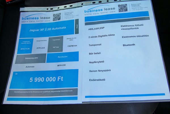 Kicsit előreszaladtam, előbb járjuk körbe a kiszemelt példányt, mint a piacon. Ez az XF 2.2 dízel automataváltós. 2014 novemberében került forgalomba és azóta körülbelül 117 ezer kilométert tett meg. Cégautó létére ez nem sok. A másik két autóban egyébként 160 ezer fölött volt az érték. Az alacsony futásteljesítmény egy viszonylag drága szervizelésű autónál még egyértelműbb előny.