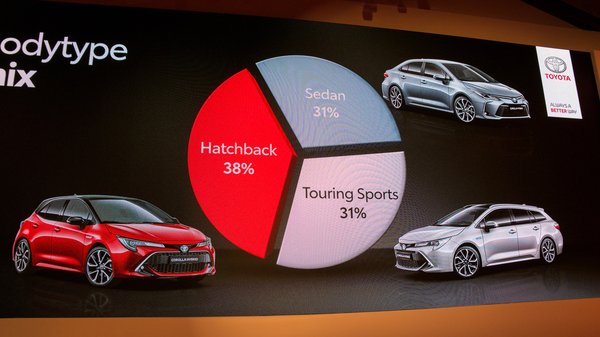 Itthon áprilistól érkeznek meg az új Corollák, az ötajtós és a szedán épp hatmillió alatti vételárral, a kombi pedig 6,2-től indul az alap Active kivitelben. A gyengébb hibrid felára 1,1 millió forint az alapmotorokhoz képest, a 2 literes hibrid további 660 ezer forint, érzésem szerint ez inkább azoknak szól, akiket a dízel is csak azért motivált, mert 180 lovas. A tervek érdekesek, nagyjából az európai eladások kétharmadát tervezik a hibridekből, de itthon is 50 százalékot várnak belőlük. Mifelénk valószínűleg a szedán fog a legjobban fogyni (45% a terv), második pedig a cégautónak is szánt kombi (30%), és a maradék a Hatchbacké.