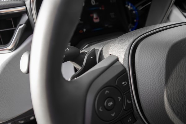 A legviccesebb az, hogy az erősebbik hibridnél váltófülek is vannak a kormányon, mintha csak egy rendes automata váltó lenne az egész rendszer mögött, nem pedig egy fokozatmentes erőátviteli egység – éppenséggel még motorfék-jellegű hatást is el lehet vele érni, de főleg a hangerő nő. Az alap hibriden a D (előremenet) program mellett van egy B is, ami több motorfékhatást ad, ha elvesszük a gázt. Van rendes fék is, ami eleinte csak visszatermel, és csak határozottabb lassításkor fékez igaziból, ennek picit lehetne arányosabb a pedál visszajelzése, de nem gáz így sem.