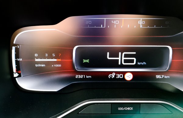 Aztán ha nagy kegyesen betöltötte a modult – tényleg, mi közöm hozzá, hogy betölt?! –, elkezdjük nézegetni a műszerfalat. Van több üzemmód. Én a műszerek üzemmódot választottam, érjen bár megvetés a franciák részéről, hogy nem házipornót, vagy sajthorrort nézek a műszerfalon. Szóval műszerek mód: középen két nagy számmal a sebesség, fölötte az ős DS stílusában ugyanaz egy leolvashatatlan vízszintes csúszóskálán, ami ránézésre simán lehet egy francia boroshordó ballingfoka, vagy egy német vásárló szisztolés vérnyomása, amikor meglátja ezt az állatságot.