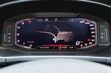 Belül-elöl teljesen új, se nem kortárs seatos, és még nem is az oldalágról jött a stílus. Itt dijáznilag már nincs nyoma a kinti bátorságnak, sőt, a német társaknál is németesebb lett, de az amúgy tök egyszerű összkép mögött nincs semmi fájdalmas. Ott van például a lebegő tablet, ami most épp nem számít cikinek, de a többség inkább beépíti. A Seat nem, de fontosabb, hogy a nyolccolos központi kijelző alapáras. Van hozzá egy grafikailag egyszerű, de legalább logikus menü, és ha itt nem elég az infó, itt is van már digitális műszeregység sokféle nézettel a kormány mögött.