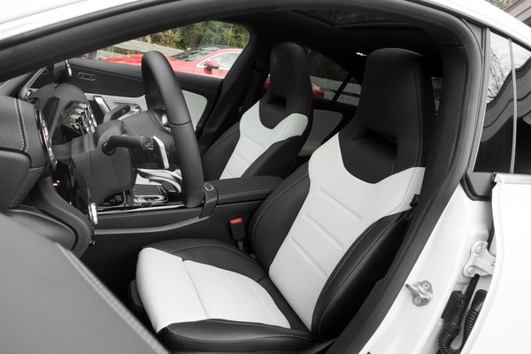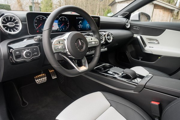 A beltérben nincs sok meglepetés, ez egy A osztály belseje, de a világos bőr-műszerfal és a matt, lakkozás nélküli fa is szép. Kellemes élettér így, még úgy is érdemes lehet bevállalni a világos belsőt, hogy vélhetően melósabb tisztán tartani, és a nem sportos ülések is kellemesebbek voltak, mint az AMG-line darabjai. Hátul természetesen kisebb a hely, bár 182 centivel nem értem hozzá sehol a kárpithoz, de a tetővonal nyomasztóan közel van. Az autó tetővonala hordoz magában valamiféle presztízst, vélhetően ezért is fogják venni, így a hátsó utasok kényelme annyira nem szempont.