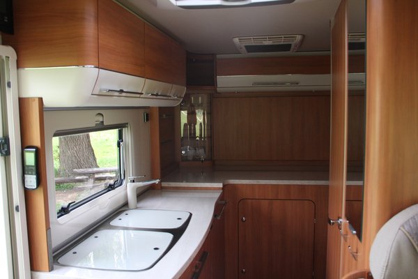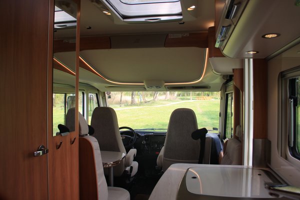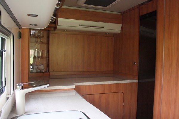A B osztály 444-es modellje hátul nem rendelkezik ággyal, hanem a konyhapult fordul be, a 350 kg-mal terhelhető garázs felett hatalmas helyünk van a főzés előkészítéséhez. Ebből is jól látszik, hogy próbálnak minden igényt kielégíteni, ez az autó Jamie Olivernek is elegendő helyet biztosít főzéshez. Az egy másik kérdés, hogy ez az óriási pult nagy helyet elvesz, ami menet közben nem használható pakolásra, mert minden leesik innen egy fékezéskor. Ezért aztán nem biztos, hogy mindenkinek ez az elrendezés lesz a kedvence. Erre szokás azt mondani, hogy mindent nem lehet egyszerre, ahogy például a Dometic klíma elveszi az utolsó tetőablakot, ami pont a hátsó pultnak adna egy kicsit több fényt. Nyilván így sincs sötét, mert az ablakok nagy méretűek, az integrált felépítmény hatalmas első ablakaiból árad a fény befelé.