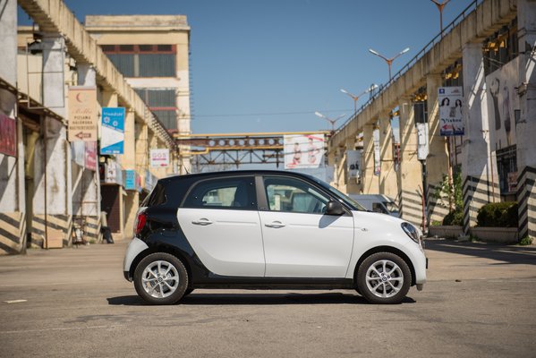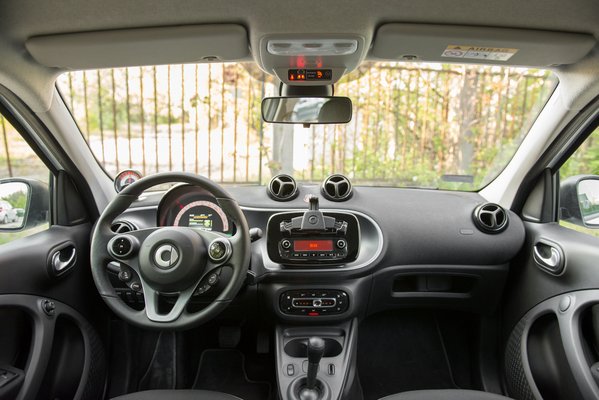 Nekem mondjuk egy konkurens ugrik be, az előző Nissan Leaf, ami megint csak más kategória – egy teljes méterrel hosszabb, minden irányban nagyobb, és hát egy normális, kényelmes, nagyon jó autó. Teljes értékű kompakt. Ahhoz képest nem igazán értem, mire jó egy ilyen Forfour; keresztben nem lehet vele beparkolni egy fél helyre, a szűkösség meg legfeljebb akkor előny, ha a vezető (és az utasok) tériszonyosak. Viszont ez, a Smart Forfour a piac legolcsóbb villanyautója, ha a golfkocsikat nem számítjuk. Ez kívülről nem is látszik rajta. Tőről metszett megosztó dizájn: nekem történetesen nagyon tetszik, de hamar meguntam azokkal vitatkozni, akiknek nem. Szerintem még most is jó a közel öt éves mopszorr – a Smart Forfour 2. generációja 2014-ben mutatkozott be, azóta néz ki így.