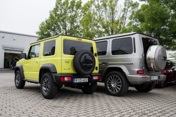 Egyszerre kedves és komoly, robusztus és esztétikus, nem is tudom, hogy lehetett ennyire jól összedekázni. Nyilván mindenki a G Mercit látja bele, és hogy, hogy nem, a bemutatón is feltűnt az aktuális G, nyilván azonnal össze kellett fényképezni a kettőt. A Suzukisokból ki is váltotta az önigazolási kényszert, és ki kellett hangsúlyozni, hogy Jimny (illetve az elődje, az LJ10) 1970 óta létezik, míg a G Merci csak 79-től. Ezzel a gondolatmenettel csak az a baj, hogy az első Suzuki terepjáró inkább egy nyersanyaghiányban tervezett Willys Jeepre emlékeztet, de főleg az új Jimnyt nem kell megvédeni a G-vel szemben: két kocka mindenképp hasonlítani fog egymásra.