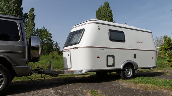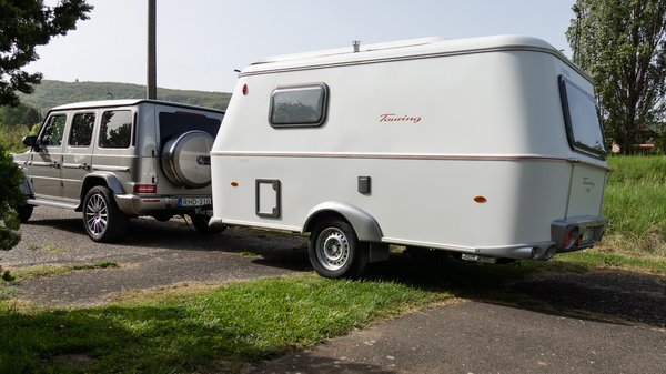 Ez azért is illett a G-hez, mert a Touring az Eriba retró családjába tartozik, így a két dinoszaurusz összeköttetett. Kapcsoláskor örömmel láttam, hogy a lakón szériában kilengésgátló vonófej van. Egyszerű szerkezet, pici fékbetétekkel, amik a gömbre nyomódva akadályozzák, hogy a vontatmány elkezdjen csapkodni. Csak arra kell vigyázni, hogy ilyen vonófej használatakor még véletlenül se zsírozzuk be a vonóhorog gömbjét.