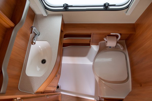 A főzőpulttal szemben a korábban említett fürdőszoba található. Érdekes megoldás, hogy a tető vászna ezt külön körülöleli, viszonylagos magány biztosítva. Praktikus, hogy a tetővel együtt a fürdőszobai tükröt is feltoljuk, így magasabbra nőtt emberek se csak a hasukat látják benne.