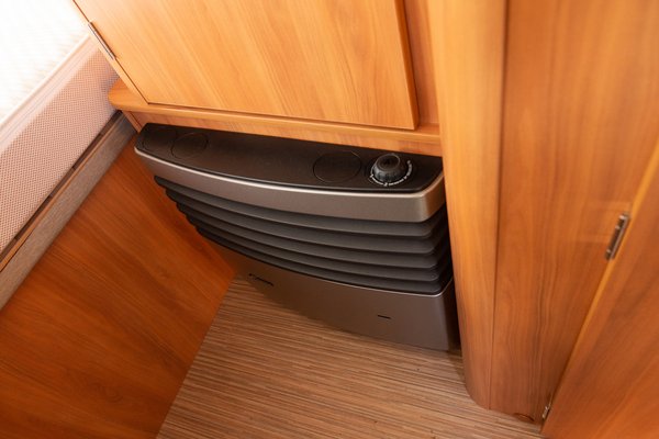 Reggel elég hűvös volt, így begyújtottam. Itt látszott a legjobban, hogy nincs új a nap alatt, a Truma fűtés pont ugyanolyan konvektorszerű kocka az ágy mellett, mint nálam, csak modernebb a külseje. Na meg itt nem volt levegős körfűtés, így kicsit pontszerűen melegedett, de ekkora beltérnél ez kevésbé zavaró, 2-es fokozaton is pillanatok alatt meleg lett.